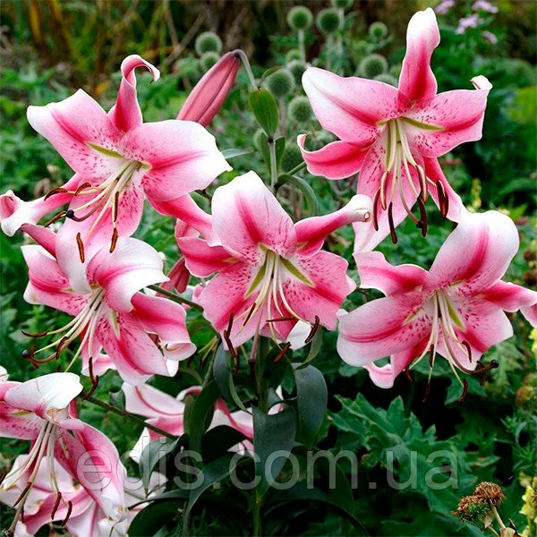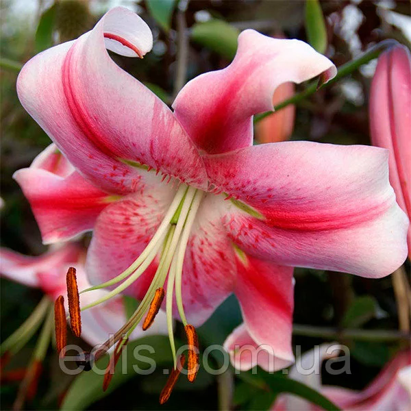 Лилия От гибрид AnastasiaЧудовий гібрид лілії Східної та лілії Королівської (Lilium regale), виведений у США у 1998 році. У висоту стебла можуть досягати 2,5 м. Від східних лілій у 'Анастасії" прекрасний аромат, великий розмір квіток і рожевий колір у пелюстках, а від трубчастих — вигнуті пелюстки, білий колір по краях і малинові сосочки.