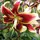 Цибулини багаторічних кольорів: лілія ШахерезадаВисота квітконоса до 240 см. Основний колір – темний, густий винно-червоний, кожна пелюстка облямована жовтим, який переходить у вузькі білі краї і кінчики. У горловині зеленкувата з золотом зірка. Золото в горлі підкреслюється в прохолодну погоду. Кінчики сильно загнуті назад. Цвітіння – середина серпня