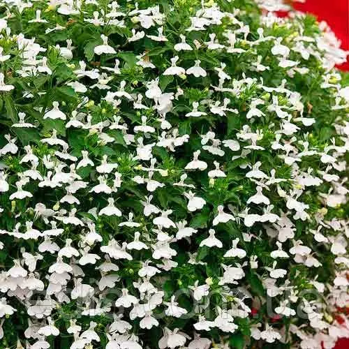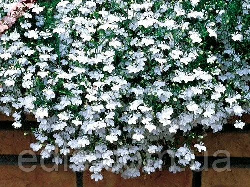 Лобелія ампельна Білий каскадСорт лобелии Белый ковер используется для выращивания нежных соцветий, создающих особое настроение и изящный вид, благодаря чему получил широкое применение среди ландшафтных дизайнеров. Его красивые стебли усыпаны мелкими цветами, создавая ощущение падающей воды или идущего снега. Растение используется при создании изысканных цветочных композиций на клумбах, цветниках и других композиций в садовом дизайне.