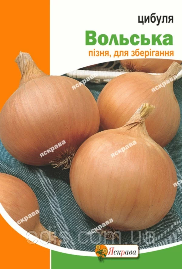 Цибуля ріпчаста Вольська – це класичний круглий жовтий цибуля універсального призначення. Цибулини середнього розміру, округло-овальної форми, зовнішні лусочки темно-жовті, внутрішні – білі, соковиті. На смак – середньої гостроти (при достатній кількості вологи та тепла влітку). За типом зрілості цибуля Вольська відноситься до пізньостиглих, вирощується з насіння в однорічній культурі тільки в південних областях, на більшій території України великі цибулини можна отримати лише у дворічній культурі (з сівалки). Придатний для тривалого зберігання.
