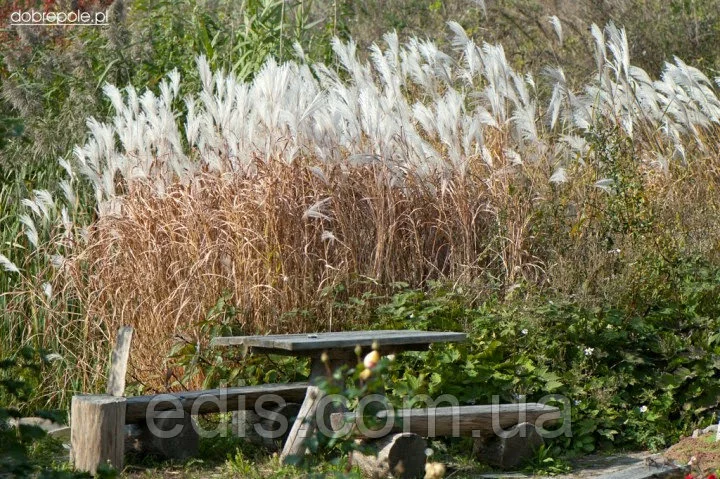 великий розмір: доросла рослина при сприятливих умовах може досягти висоти 2,5 м. З міскантуса сахароцветного виходять прекрасні природні ширми, він може закрити некрасивий паркан або будова і т. д.