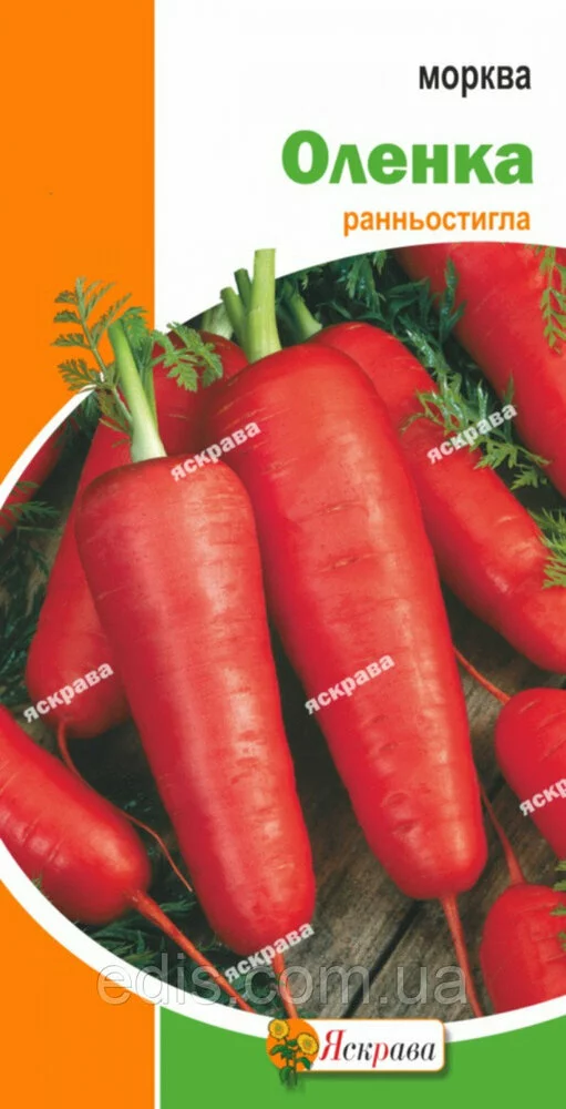 Морква Оленка 3 рРанньостиглий сорт, рекомендований для отримання ранньої пучкової продукції. Вегетаційний період до технічної стиглості 85-100 днів. Пучкова стиглість настає через 45-50 днів після сходів. Коренеплід за формою срезаноконусный, з тупим кінчиком, завдовжки 10-15 см, діаметром 5-7 див Поверхня гладка, оранжево-червоного кольору. Лежкість коренеплодів у період зберігання хороша. Сорт не схильний до накопичення нітратів.Оплата та доставка
