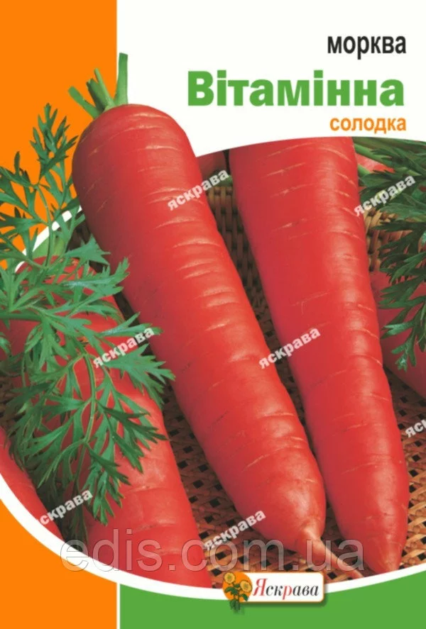 Морква Вітамінна 10 гСередньоранній сорт. Період від сходів до збирання 80-100 днів. Коренеплід циліндричний з тупим кінчиком, червоно-оранжевого кольору, довжиною 15-19 см, масою 80-165 р. М'якуш соковитий, смачний, дуже соковитий; серцевина маленька, за кольором мало відрізняється від м'якоті. Рекомендується для виготовлення морквяного соків завдяки підвищеному вмісту каротину, для споживання в свіжому вигляді і зимового зберігання.Оплата та доставка