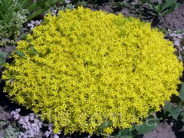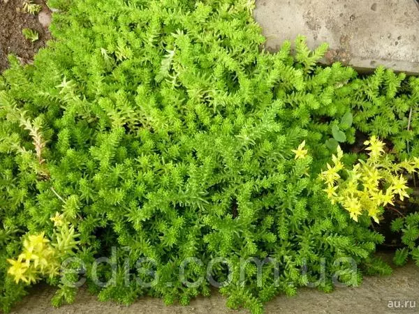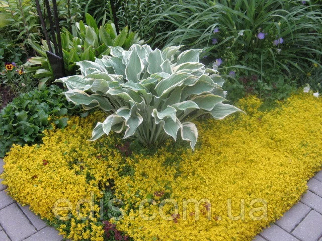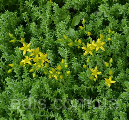 Седум їдкий (Sedum acre)Один із самих дрібних, низькорослих очитків. Виключно витривала, вічнозелена грунтопокривна рослина з м'ясистими, суккулентними листами яскраво-зеленого кольору. Седум їдкий у висоту зазвичай досягає на сонячному місці 5 див., в тіні може витягуватися до 10-12 див. В червні покривається суцільним килимом дрібних зірчастих жовтих квітів.