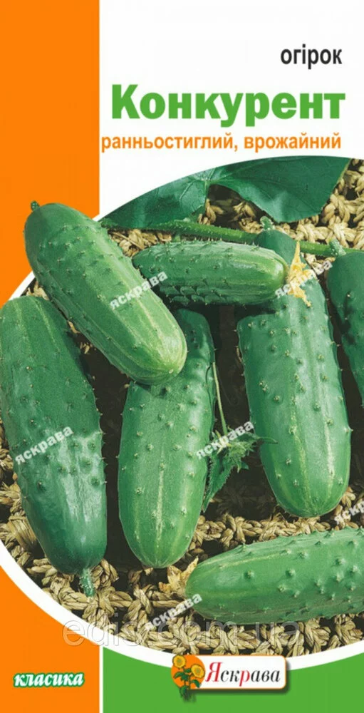 Огірок Конкурент 1 гРанньостиглий сорт. Період плодоношення триває 38-40 днів. Висока врожайність забезпечується наявністю великої кількості квіток жіночого типу. Рослина середньоплетиста. Плоди 11-12 см, масою 70-80 г, крупнобугристые, яскраво-зелені з чіткими смугами. Поперечний розріз округло-тригранний. Має гарний смак у свіжому вигляді, ароматні і без гіркоти. Відрізняється дуже хорошими якостями при засолюванні.