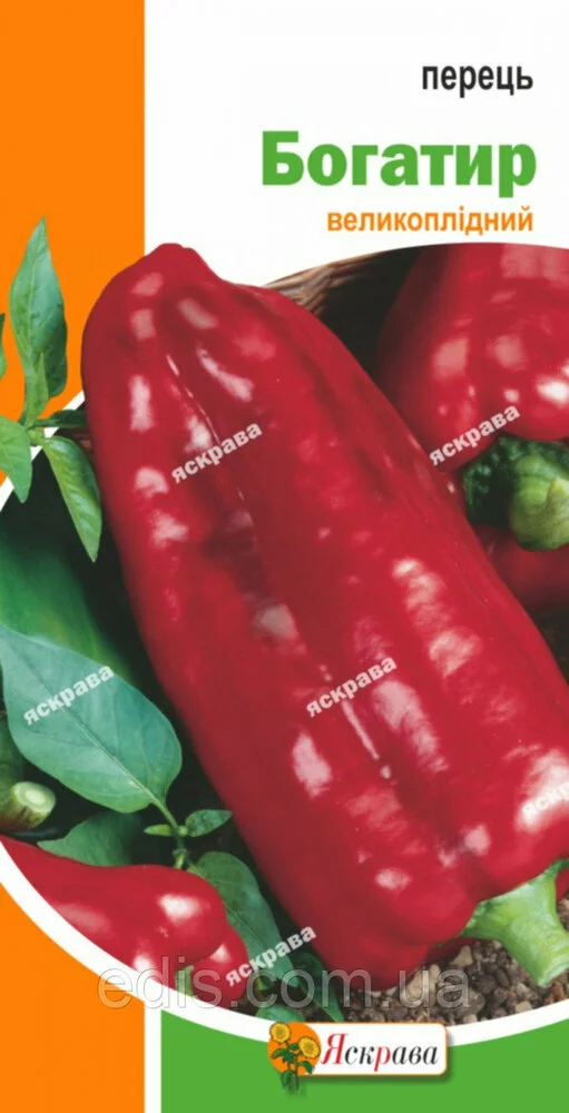 Перець Богатир 0,3 г Один з найбільш стійких сортів перцю, добре переносять навіть тривалу транспортування – Богатир. Цей сорт володіє такими характеристиками: м'якуш товщиною 5-6 мм відрізняється приємним солодкуватим смаком; перець Богатир прекрасно зарекомендував себе як для вживання в свіжому вигляді, так і в якості заготовок на зиму. Причому він зберігає свої відмінні смакові якості і в консервованому, і в замороженому стані; плоди великі культури, пружні, масою 150-180 р. Вирощування перцю Богатир може принести істотну вигоду приватним підприємцям, які займаються садівництвом. Насіння коштують дешево, при цьому культура характеризується хорошою врожайністю. Вирощувати рослину можна як в плівкових укриттях, так і відкритому гунте. Купити перець за кращою в Україні ціною можна в інтернет-магазині «Едіс». Також пропонуємо вам замовити доставку товару в Одесу, Київ, Львів, Дніпропетровськ або інше місто. Вартість послуги дізнавайтесь у компанії-перевізника.Оплата та доставка