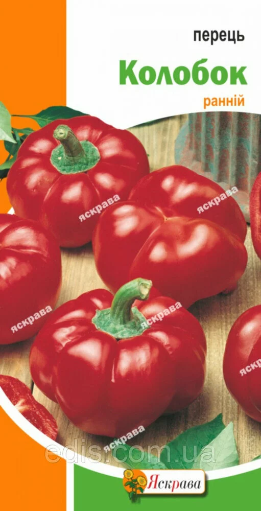 Перець Колобок 0,3 гРанньостиглий сорт для вирощування у відкритому гунте і плівкових теплицях. Період від сходів до біологічної стиглості 120-125 днів. Кущ полуштамбовый, з компактним розташуванням плодів, висотою 30-50 див Плоди округлі, гладкі, з товщиною стінок 7-9 мм, масою 90-150 р. Забарвлення плодів в біологічній стиглості темно-червона. Сорт стійкий до хвороб. Плоди придатні для споживання у свіжому вигляді та консервування.Оплата та доставка