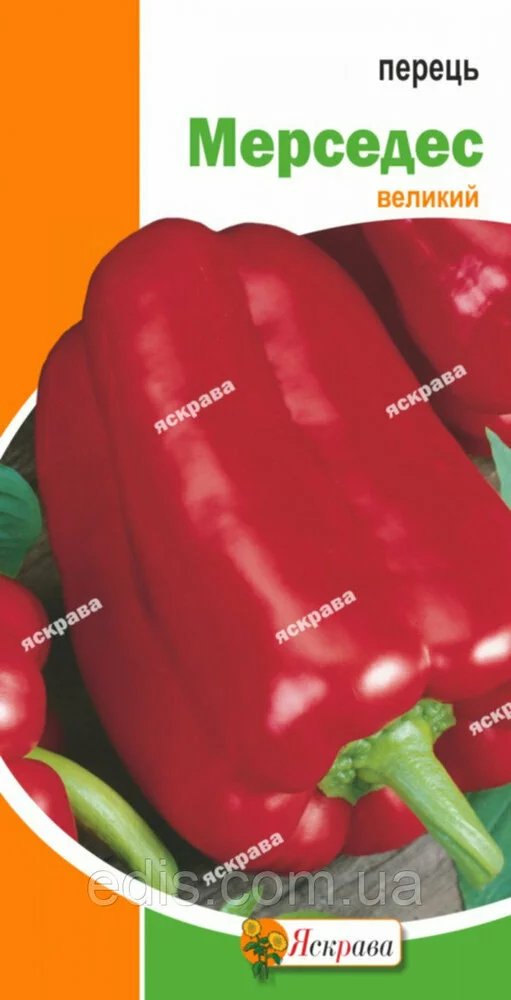 Перець Мерседес 0,3 гРанньостиглий, високоврожайний сорт. Кущ штамбовий, висотою 60-65 див. Період від появи сходів до технічної стиглості - 105-115 днів. На одній рослині формуються 15-20 плодів циліндричної форми, довжиною 12-15 см, шириною 6-7 см і масою 160-220 р. В технічній стиглості плоди червоного кольору. М'якоть солодка, соковита, з приємним смаком і ароматом. Товщина стінки плоду 7-9 мм Використовується в технічній і біологічній стиглості в свіжому вигляді і для переробки. Сорт стійкий до найбільш поширених хвороб перцю.Оплата та доставка