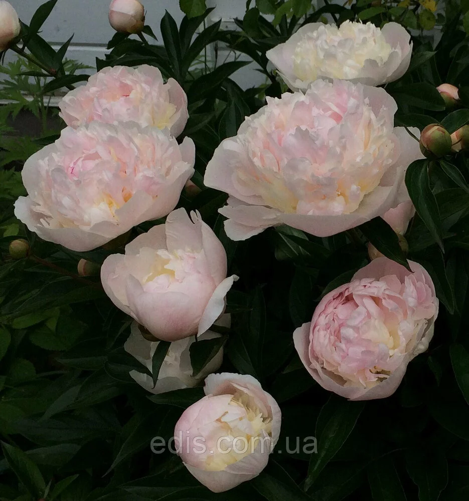 Півонія високоросла Madame Calot (Мадам Калот)Півонія молочноквіткова "Мадам Калот" (Paeonia lactiflora Madame Calot) Квітка 13 см. в діаметрі, складний, двоколірний: блідо-фіолетові спідниця і корона, серединка кремово-рожева або вершкова. Висота куща 80 см. Ароматний. Відмінна зрізка.