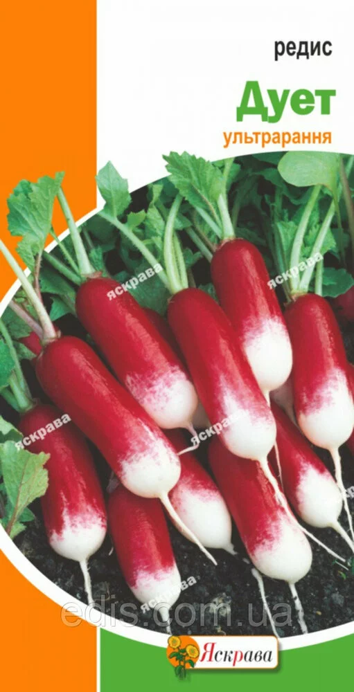 Редис Дует 3 рНовітній сорт ранньостиглий високоврожайний сорт придатний для вирощування у відкритому і захищеному гунте у весняний і осінній періоди. Вегетаційний період від масових сходів до технічної стиглості 18-25 днів. Коренеплоди, половина яких знаходиться над поверхнею грунту, середньої величини, яскраво-червоного кольору з білим кінчиком, видовжено-циліндрічної форми. М'якоть біла, іноді світло-рожева, ніжна, дуже соковита, має делікатесний смак. Сорт не дерев'яніє, не розтріскується, має прекрасний товарний вигляд.Оплата та доставка