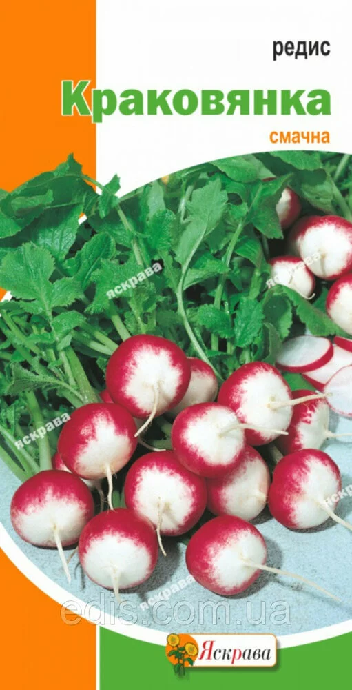 Редис Краковянка 3 рСередньоранній сорт. Вегетаційний період від сходів до технічної стиглості 25-28 днів. Коренеплід рожево-червоний з білим кінчиком, гладкий, плоско-округлої форми, діаметром 4-5 см, масою 15-25 р. М'якоть біла, соковита, солодко-гострого смаку. Рекомендується вирощувати у відкритому гунте. Сходи витримують заморозки до -3 С.Оплата та доставка