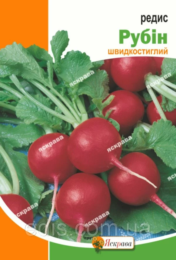 Редис Рубін 10 гПісля багатомісячного вживання консервації, коли наш організм просто зголоднів за свіжими овочами, ми дуже радіємо першому зеленому луку, який кропу, ніжним листочками петрушки. А як бажана маленька соковита редиска, яка прикрашає наш весняний стіл. У червні про неї забудуть до наступного сезону, а в травні вона - «королева столу». Ми біжимо на гядку (хто-то в магазин) за цим скромним овочем, з якого хочеться зробити свіжий апетитний салат. Редис Рубін – це ранній скоростиглий сорт, купити і посадити який варто усім, хто бажає максимально наблизити терміни збору врожаю. Йому віддають перевагу, оскільки: редис досягає стиглості вже за 23 – 28 днів; відрізняється округлою формою і червоно-малиновим кольором зовні; коренеплід може виростати до 4 см, маса складає від 11 до 28 г; смак м'якоті приємний, з м'якою гостротою; на 1 м2 можна виростити від 1 до 2,3 кг. Редис Рубін ідеальний для посадки в холодні парники, теплиці обігріваються, на відкриті гядки.Оплата та доставка