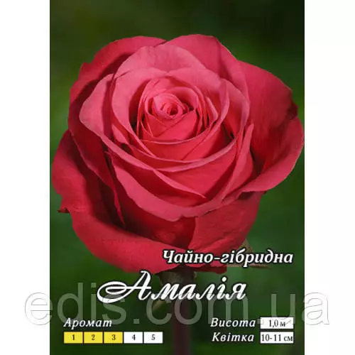 Саджанці чайно-гібридних троянд Амалія (Amalia)Переваги сорту: благородне забарвлення пелюсток та гармонійне додавання бутону, приємний тонкий аромат, тривале цвітіння. Найвигідніше Амалія виглядає в групових посадках по 3-5 кущів.