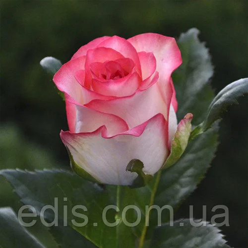 Саджанці чайно-гібридних троянд Джумилия (Jumilia)Щільні білі пелюстки з тонкою рожевою облямівкою і плавними хвилями країв. Квіти відмінно виглядають в груповій посадці.