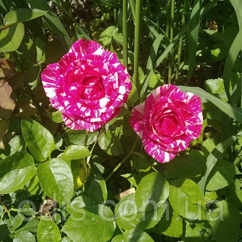 Саджанці чайно-гібридних троянд Пападжено (Рарадепо)Ефектний чайно-гібридний сорт, що має яскравий двобарвне забарвлення (малиновий з білими смужками).