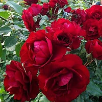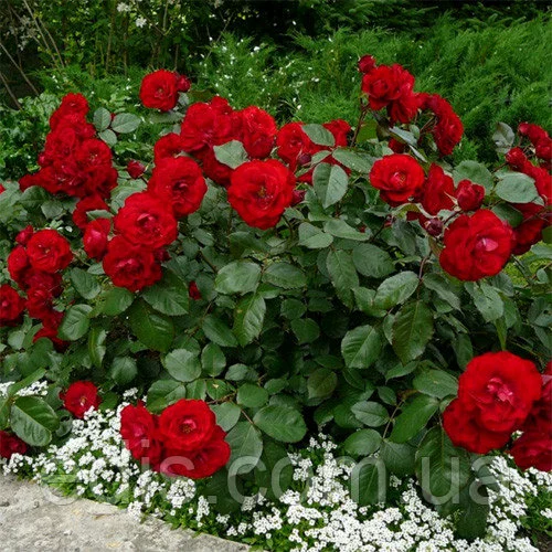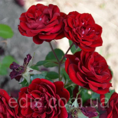 Ця яскрава рясно квітуча троянда цвіте великими кистями напівмахрових квіток, які з'являються на коротких жорстких пагонах на ветвистом прямостоячем кущі. Квітки бордово-червоні, темні, яскраві, чашоподібної форми, з золотими тичинками в центрі. Аромат майже відсутня, але в іншому – рясно цвіте все літо і осінь, відмінно переносить дощ, відцвілі пелюстки добре обсипаються. Кущ середньої висоти, підходить для клумб, бордерів і контейнерів. Першокласне садова рослина. Листя темно-зелена, блискуча.Оплата та доставка