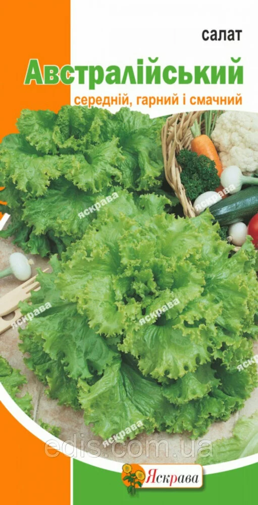 Салат Австралійський 1 гСередньостиглий, напівголовчастий сорт. Вегетаційний період від сходів до технічної стиглості - 60-70 днів. Качани рихлі, масою 300-350 г, світло-зеленого забарвлення, високих смакових якостей. Листя кучеряві, хрусткі і соковиті. Рекомендується для вирощування у відкритому гунті і плівкових теплицях. Використовується для споживання у свіжому вигляді.
