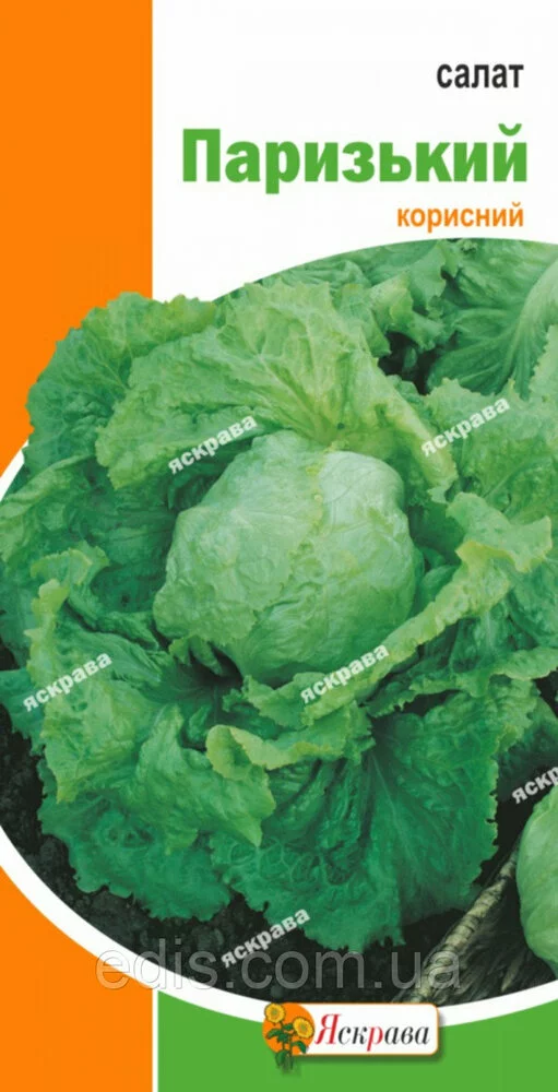 Насіння овочів: Салат Паризький 10 р.Салат Паризький – середньостиглий сорт качанового типу. Період вегетації від сходів до технічної стиглості 50-55 днів. Листя еліптичні, хрусткі, щільні, зовнішні темно-зеленого кольору, внутрішні – майже білого; утворюють пухкі качани видовжено-овальної форми, масою 500-700 р.