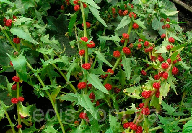 Шпинат суничний Шпинат суничний (він же жмида звичайна або марь многолистная) відноситься до сімейства амарантових і є однорічній овочевою культурою. Візуально це невеликі щільні кущики, які не перевищують висоти 40-50 див. На відміну від звичайного шпинату, суничний має листя з гострими зазубреними краями копьевидного типу.Оплата та доставка