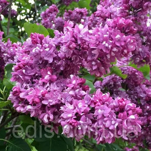 Бузок Вогні ДонбасуБутони великі, темно-лілові з червоним відтінком; квітки пурпурно-лілові зі світло-ліловими кінчиками пелюсток, великі, діаметром 2,5 см, махрові - з двох-трьох тісно зрушених віночків, стійкі до вигорання, ароматні; пелюстки овальні, з піднятими краями. Суцвіття з однієї пари міцних, пірамідальних, середньої щільності мітелок розміром до 20 X 10 см, з відокремленими нижніми відгалуженнями. Кущі середньої висоти, розлогі. Цвіте рясно, в середні строки.