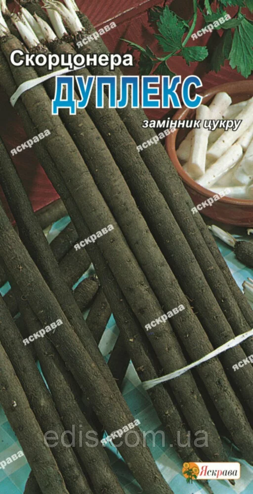 Скорцонера Дуплекс 1 гБагаторічна рослина, яке іноді називають чорним корінням за чорний колір коренеплоду. Вже в перший рік у ґрунті утворюється коренеплід довжиною 25-30 см з пряним ніжним смаком. Споживається коренеплід в їжу у вигляді приправи до супів, а також як самостійне овочеве страву або гарнір. Наявність у коренеплодах скорцонеры інсуліну дозволяє використовувати рослину людям, що страждають цукровим діабетом. Збір коренеплодів на зберігання проводять на початку осені. Частина рослин залишають зимувати в ґрунті для збору навесні наступного року.Оплата та доставка