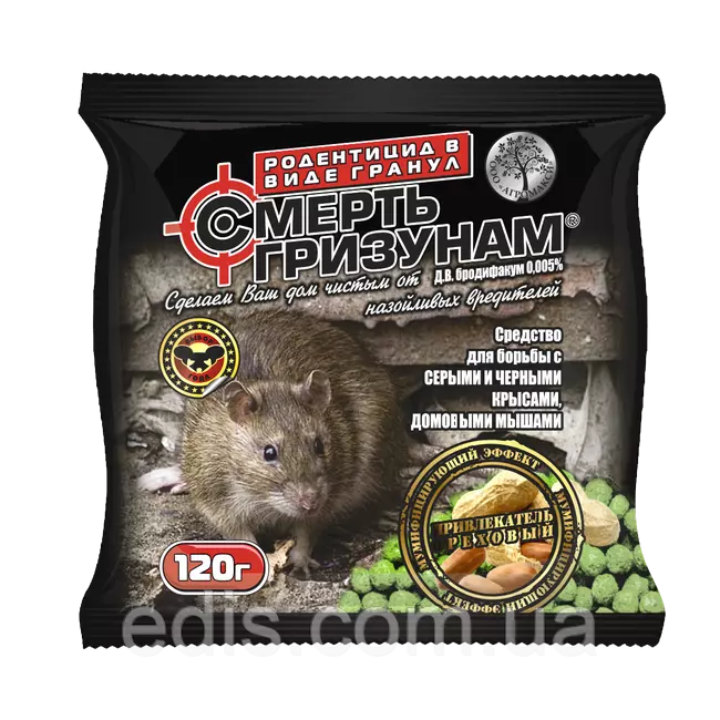 Призначення препарату: засіб у вигляді отруєною зернової суміші для знищення щурів і мишоподібних гризунів у житлових та нежитлових приміщеннях, а також сільськогосподарських угіддях та на присадибних ділянках. Склад: крупа екструдована (гранула), заманник (горіх), гіркота, барвник, допоміжні речовини. Діюча речовина: бродіфакум – 0,005%. Ефективність: загибель гризунів настає через 3-5 днів після поїдання суміші, переважно на відкритому місці.Оплата та доставка