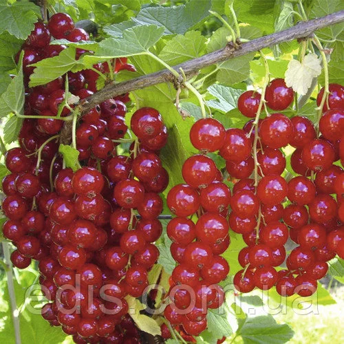 Смородина червона ТроїцькаКущ усипаний гронами великих яскраво-червоних ягід середнього терміну дозрівання.