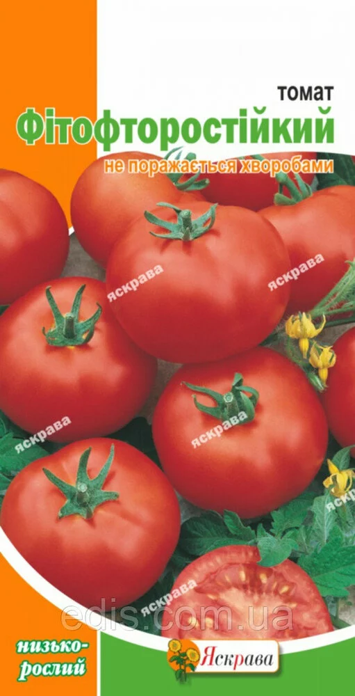 Томат Фітофторостійкий 0,1 гДуже стійкий до захворювань, ультраранній сорт. Період від сходів до дозрівання плодів 80-90 днів. Кущ компактний, висотою 30-60 см. Плід червоного кольору, округло-плоский, гладкий, щільний, м'ясистий, масою 80-150 г, гарного смаку. Врожайність і відмінна транспортабельність плодів. Плоди використовують для споживання у свіжому вигляді, цільноплідного консервування та приготування томатопродуктов. Вирощується у відкритому гунте і у весняних плівкових теплицях, розсадою або безпосереднім висівом насіння у відкритий гунт. Сівба на розсаду насіння на глибину 1-1,5 см. Висадка розсади в гунт у віці 50-60 днів. Потребує легких родючих грунтів.