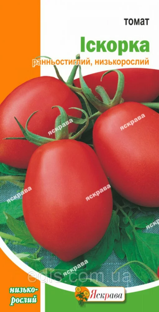 Томат Іскорка 0,2 гРанньостиглий сорт. Вегетаційний період від сходів до початку дозрівання 95-105 днів. Кущ низькорослий, висотою 40-55 см. Плоди сливоподобные, гладкі, яскраво-червоного кольору, масою 80-110 м, відмінних смакових якостей, не розтріскуються, добре зберігаються і транспортуються. Сорт універсального призначення, використовується для споживання у свіжому вигляді, переробки.Оплата та доставка