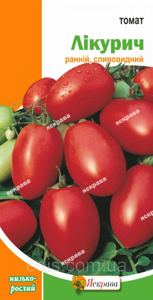 Томат Ликурич 0,2 гСорт ранньостиглий. Від сходів до дозрівання - 100-108 днів. Рослини середньо розгалужені, висотою 40-55 см. Плоди сливовидні, міцні, масою 70-100 г Сорт з дружнім дозріванням плодів, універсального використання, транспортабельний. Смакові якості хороші. Сорт слабо вражається фітофторозом.
