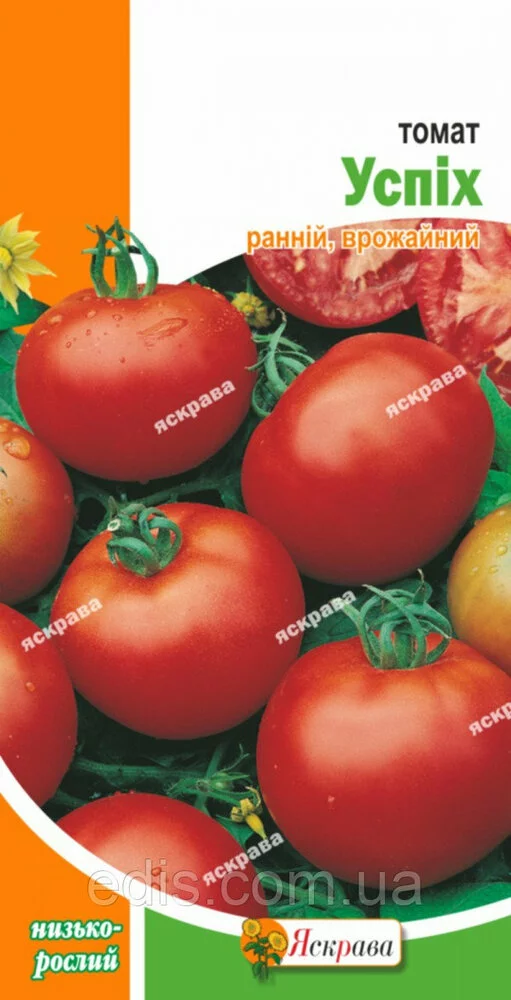 Томат Успіх 0,2 гРанньостиглий сорт, призначений для вирощування томатів у відкритому гунте і в плівкових теплицях. Дозрівання плодів починається через 85-100 днів після появи сходів. Формує компактний кущ детермінантний, заввишки 50-70 см. Плоди червоні, плоско-округлої форми, високих смакових якостей. Середня маса - 70-80 г Придатні для споживання в свіжому вигляді і для переробки.Оплата та доставка