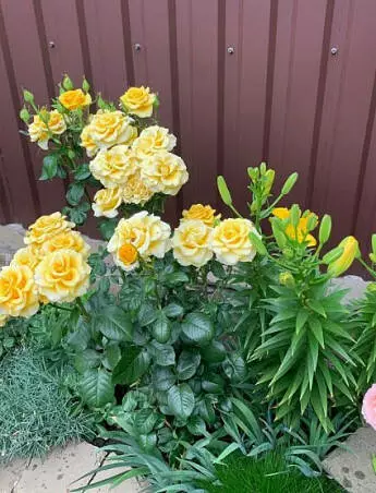 Форма квітів — класична бокаловидна, діаметр — 8–10 см. Пелюстки (35–50 штук в кожному) плотні, ныби фарфорові, дуже яскравого, густого жовтого кольору. Під прямими сонячними променями колір вигорає до масляно-жовтого, при дефіциті світла з'являється рожевий підтон. У повністю розкритих квітів на краях пелюсток з'являється тонка шафраново-помаранчева кайма.
