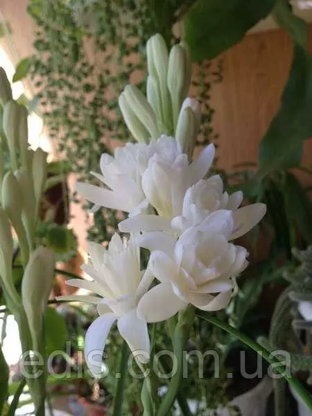 Суцвіття – колосоподібна кисть висотою 60-70 сантиметрів, складається з 20-30 елегантних чисто-білих махрових квіток діаметром 4-6 сантиметрів, розташованих попарно. Пелюстки туберози мають досить щільну структуру і зовні виглядають як воскові або порцелянові. Недарма на батьківщині, в Мексиці, її називають кам'яною квіткою, в Китаї – ndash; запашним нефритом, а в Росії – ndash; білою перлиною.
