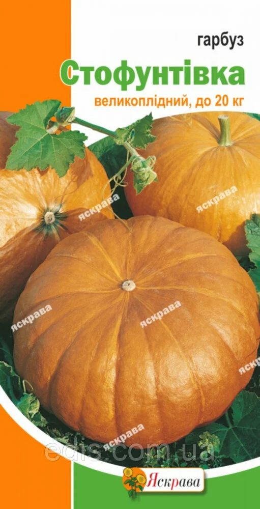 Гарбуз Стофунтовка 3 рВисоковрожайна культура. Плоди цінні вмістом цукру, крохмалю, вітамінів, каротину, клітковини, пектинових речовин, органічних солей, заліза, фосфору. Використовується для виготовлення соків, пюре, в кондитерських виробах, для дієтичного харчування, а також як кормова культура. Насіння широко застосовують у медицині, з нього виробляють високоякісне масло. Плоди добре зберігаються протягом зими і весни.Кращим строком для посіву насіння в гунт є кінець квітня-початок травня. Сіють квадратно-гніздовим способом. Глибина загортання 5-7 див. Норма висіву 2-3 насінини на 1 пог.м.Оплата та доставка