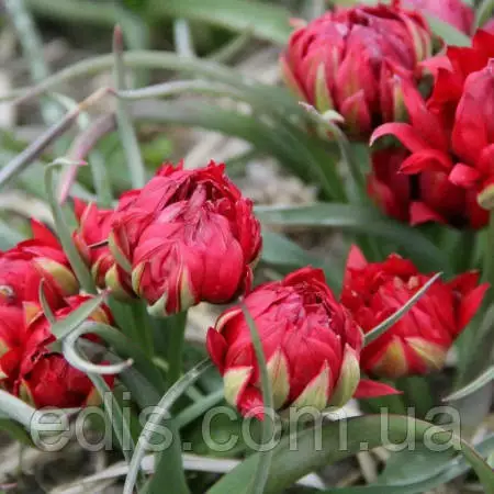 Чарівна новинка в компанії малюків – півонієподібний карликовий тюльпан Саманта. Великі, як для ботанічних сортів, махрові, насичено-червоні квіти. На сонячному місці іноді стебла настільки короткі, що схожі на льодяники бутони сидять на землі. Шикарний тюльпан для газонів, горщиків, альпійських гірок, бордюрів.