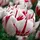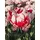 Цибулини квітів: Тюльпан махровий пізній Карнавал де НицьВеликі квіти піоновидні. Забарвлення перламутрово-біле з криваво-червоними язичками полум'я. Листя декоративні – смарагдово-зелені з кремовим кантом