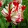 Тюльпан папуговий Estella RijnveldЕкзотичний сильногофрований тюльпан, з'єднує у своєму фарбуванні малиново-червоні, кремово-білі і зелені "сплески". Особливо сильне враження справляє при посадці групами – пелюстки, що тріпочуть під дією вітру, нагадують танець вогню. Тривалість цвітіння – 8-12 днів
