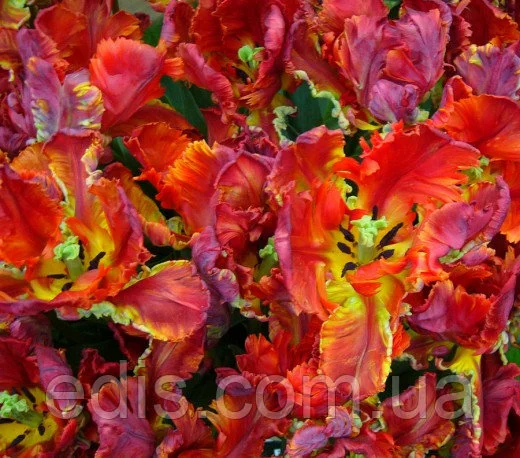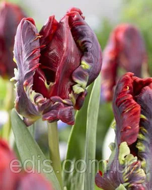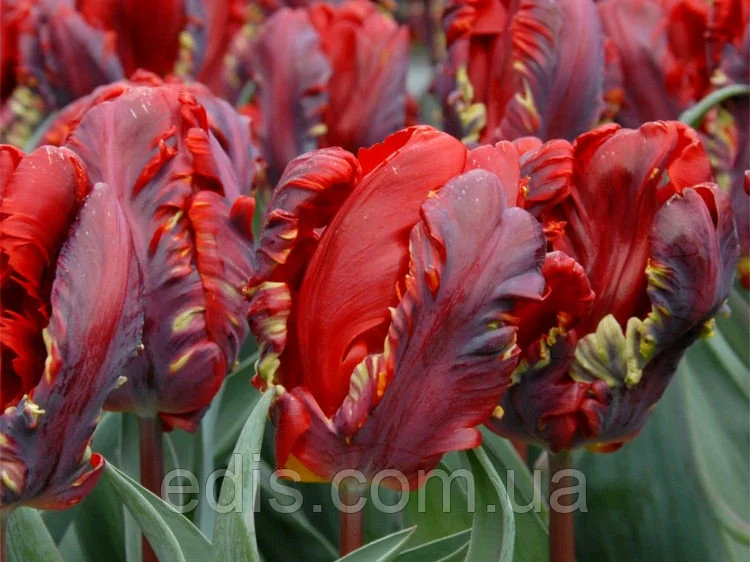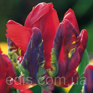 Цибулинки квітів: Тюльпан папуговий Рококо.Дуже популярний сорт, який незмінно вражає і екзотичною формою квітки, і барвистою палітрою кармінного, вогненно-червоного, багряного, фіолетового кольорів, а також жовто-зеленого в денці. Грубе, міцне стебло. Один із найбільш приголомшливих сортів серед червоних тюльпанів. Придатний для вигонки.