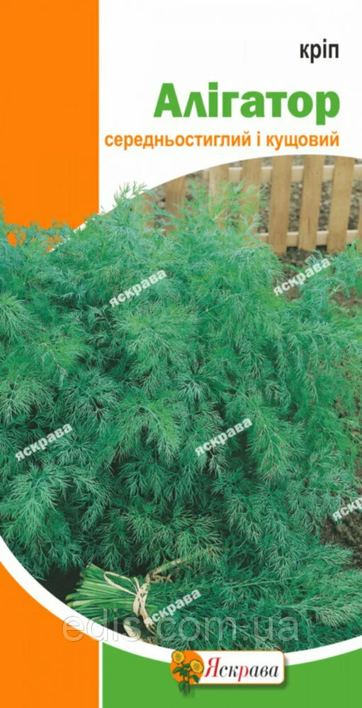 Кріп Алігатор 5 гСередньостиглий (40-45 днів від сходів до збору врожаю) сорт кущового типу. Призначений для вирощування на зелень. Довго не викидає парасольку, можливо багаторазова зрізка зелені. Розетка листя велике, підведена, що полегшує вирощуванні і менше забруднює листя після дощів. Листя зелені з сизим відтінком, ароматні, високої якості. Зелена маса однієї рослини становить у середньому 30-60 м, при гарній агротехниці - більше 100-150 р. Урожайність 1,5-2,5 кг/м2.Оплата та доставка