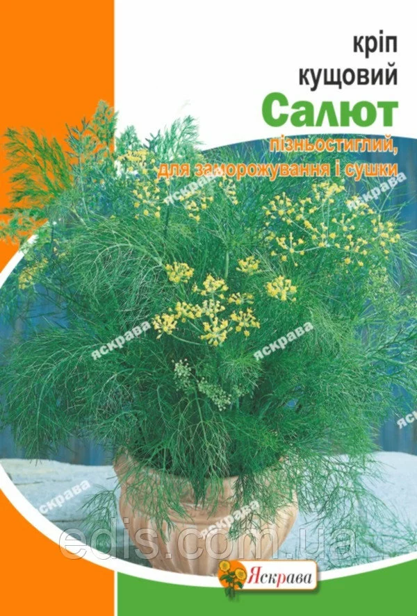 Кріп Салют 20 гСорт пізньостиглий, гіллястий. Зелень ніжна, соковита, інтенсивно зелена. Довгий час зберігає товарні цінності. Сорт призначений для заморожування і сушіння. Багатий хімічний склад забезпечує високу харчову цінність. Смакові якості кропу споріднені з його лікувальними властивостями. Всі частини рослини містять ароматичне масло. Використовують зелень кропу, а взимку і насіння, як приправу до різних страв і салатів. Зелень заготовляють на зиму, для засолювання чи высушивют в тіні, при цьому зберігається її ароматна і інші цілющі властивості. Скоростигла, холодостійка, світлолюбива, не вимоглива до умов вирощування рослина. Сходи з'являються через 10-20 днів і за короткий час утворюють велику масу зелені.Оплата та доставка