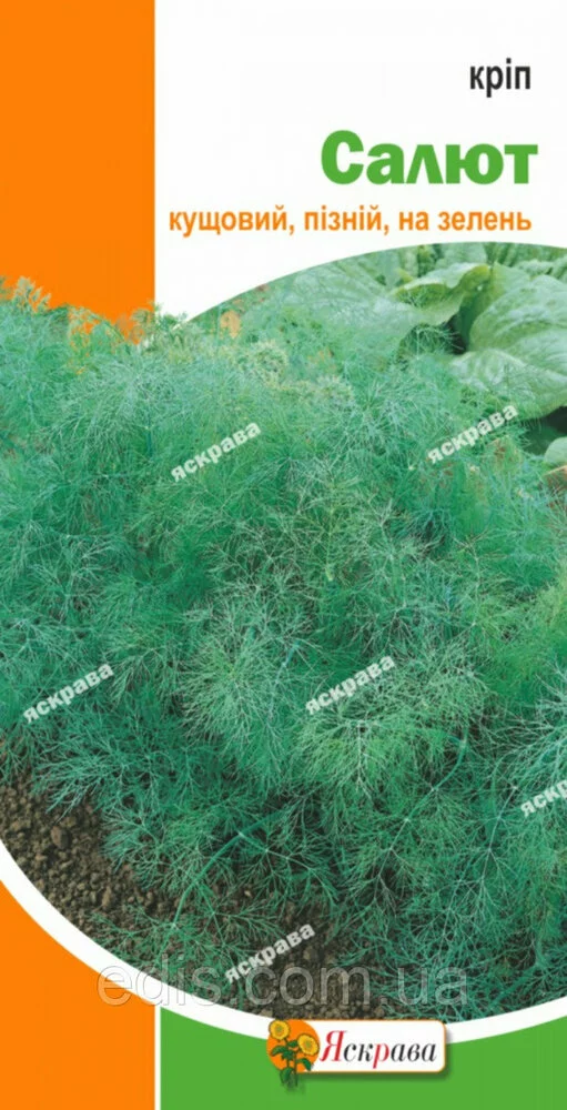 Кріп Салют 5 гСорт позднеспелый, ветвистый. Зелень нежная, сочная, интенсивно зеленая. Долгое время сохраняет товарные ценности. Сорт предназначен для замораживания и сушки. Богатый химический состав обеспечивает высокую пищевую ценность. Вкусовые качества укропа родственные с его лечебными свойствами. Все части растения содержат ароматическое масло. Используют зелень укропа, а зимой и семена, как приправу к различным блюдам и салатам. Зелень заготавливают на зиму, для засолки или высушивют в тени, при этом сохраняется ее ароматичность и другие целебные свойства. Скоростигла, холодостійка, світлолюбива, не вимоглива до умов вирощування рослина. Сходи з'являються через 10-20 днів і за короткий час утворюють велику масу зелені.Оплата та доставка