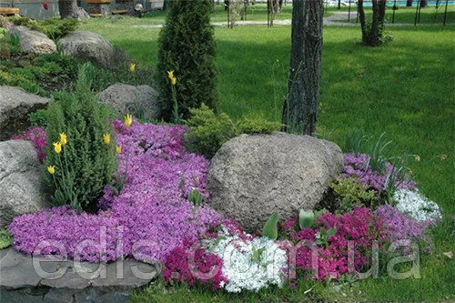 Завжди виграшно на тлі сірого сприймається фіолетовий колір. Використовуйте це, підбираючи рослини для своєї рабатки або альпійської гірки. У нашому інтернет-магазині багато низькорослих і середньорослих фіолетових квітів, красу яких вдало підкреслить роговик.