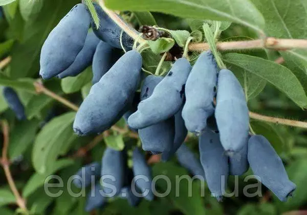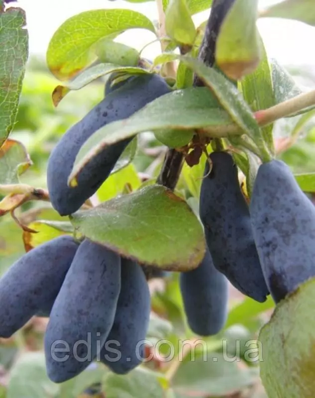 Жимолость Бакчарский ВелетеньЯгоди жимолості Бакчарский велетень дуже великого розміру (середня маса — 1,8 м, максимальна вага — 2,5 м, довжина — від 4 до 5 см, діаметр — 1,2 см), злегка асиметричні, видовжено-овальної форми, м'які, з слабогорбистою поверхнею і сухим рубчиком. Шкірочка середньої товщини, темно-синього кольору, з сильним восковим нальотом.